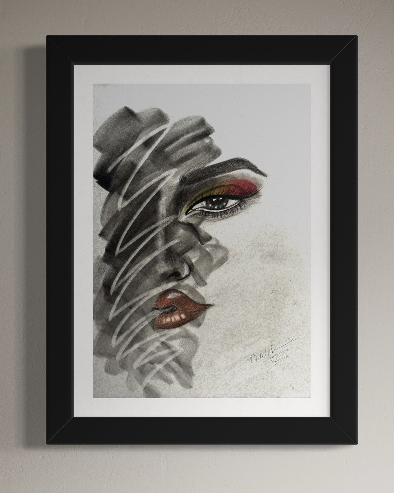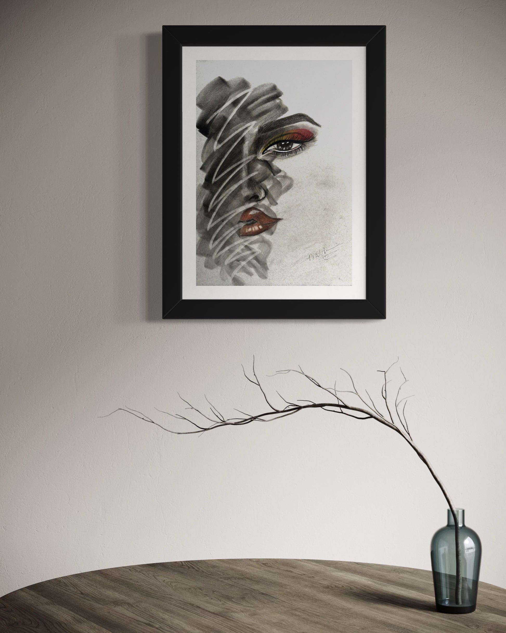 A contemplative face peers through shifting layers, as if caught between worlds of seen and unseen. This work invites the viewer to pause, reflect, and embrace the mystery woven into the fabric of identity and emotion.