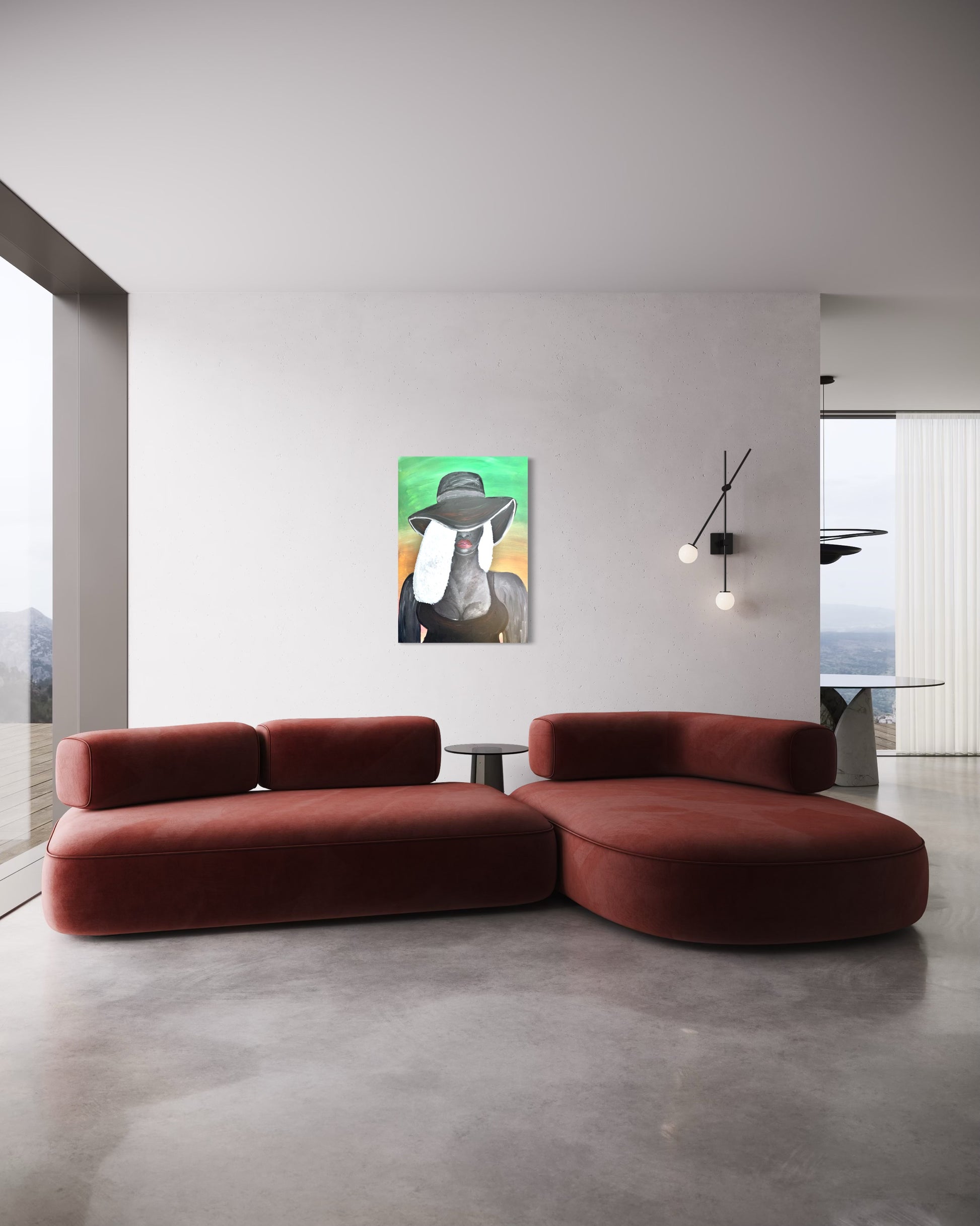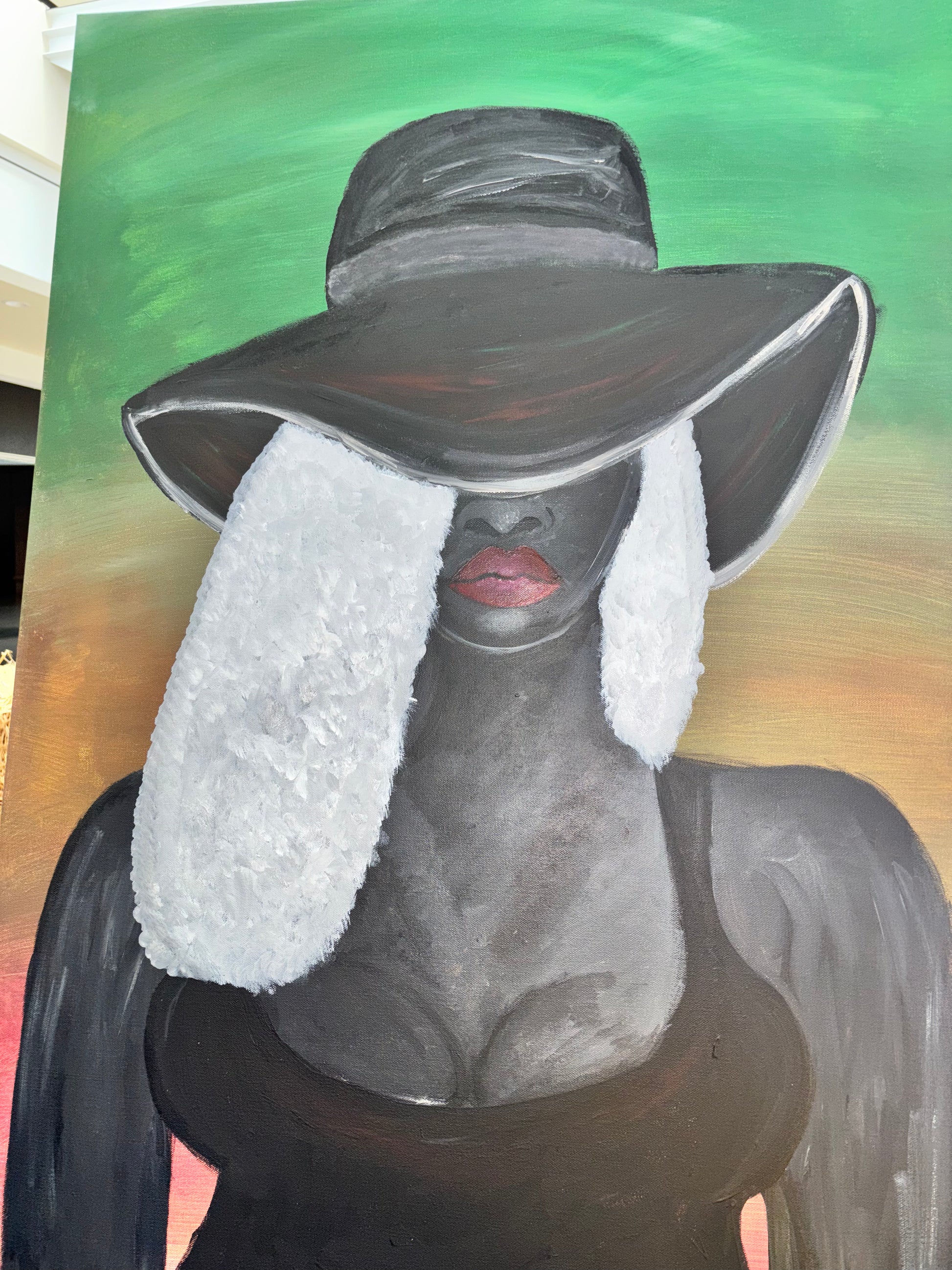 A striking portrait of quiet confidence and allure, Mystery in Grace captures the essence of feminine strength shrouded in elegance. The figure, painted in rich charcoal tones, wears a wide brimmed hat that veils her eyes, inviting curiosity while preserving her mystique. Soft white textured hair cascades down her shoulders, contrasting beautifully with her deep complexion and bold, serene lips. The subtle gradient background of green fading into amber radiates warmth and balance, enhancing the composition’s calm yet powerful energy.