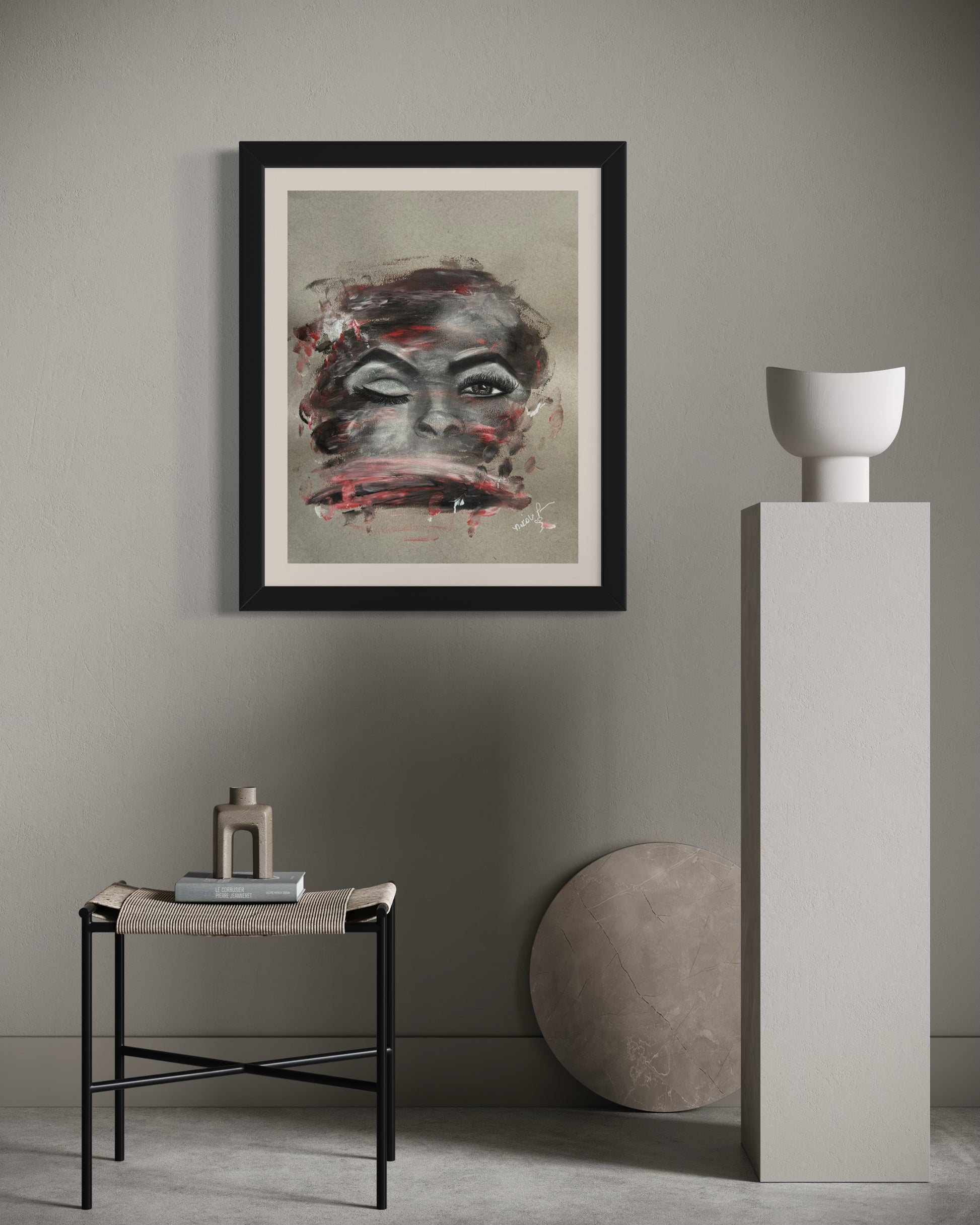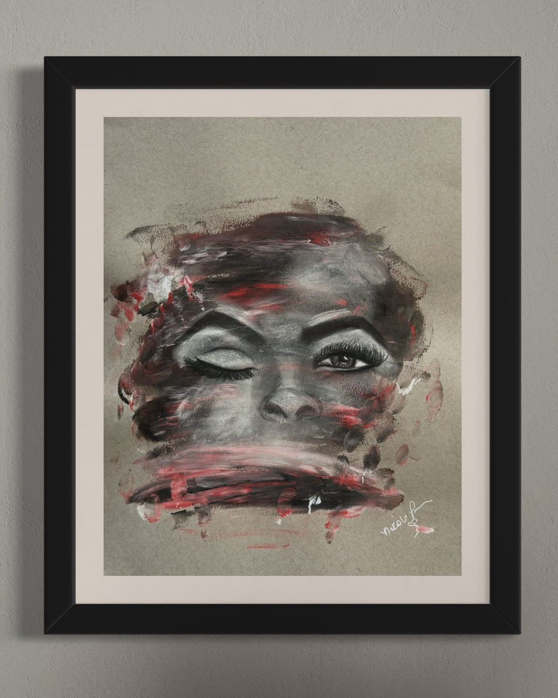 A captivating portrait blending mystery and allure, with the face partially obscured by swirling colors.