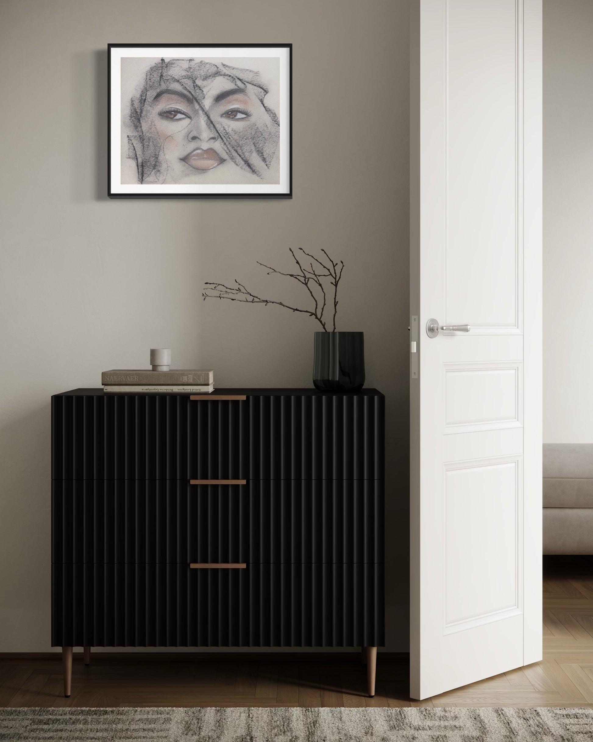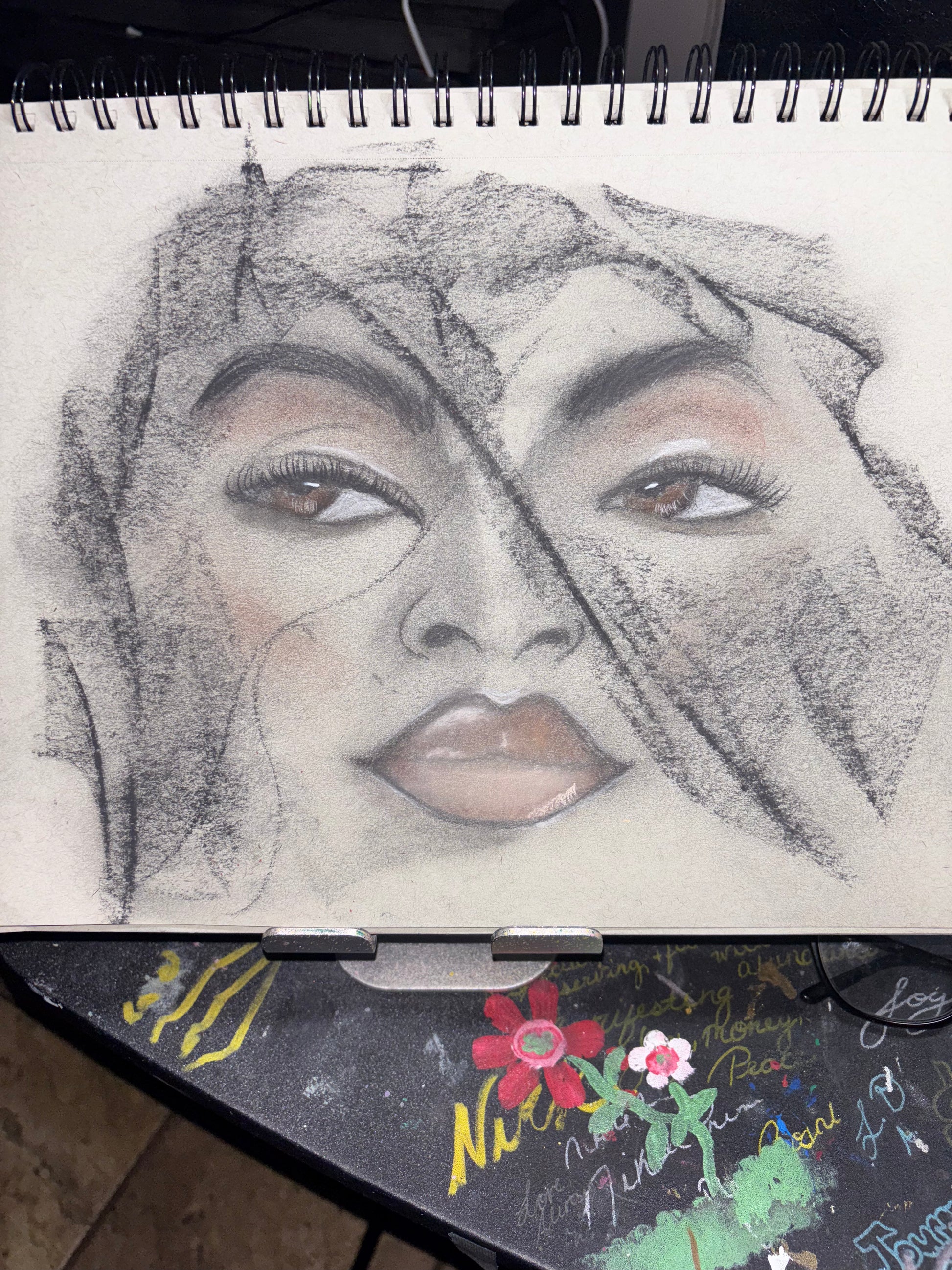Emerging from abstract textures, the figure’s features feel both revealed and concealed—like echoes of thoughts left unsaid. The softness of the lips against the layered charcoal strokes reflects the tension between silence and expression.