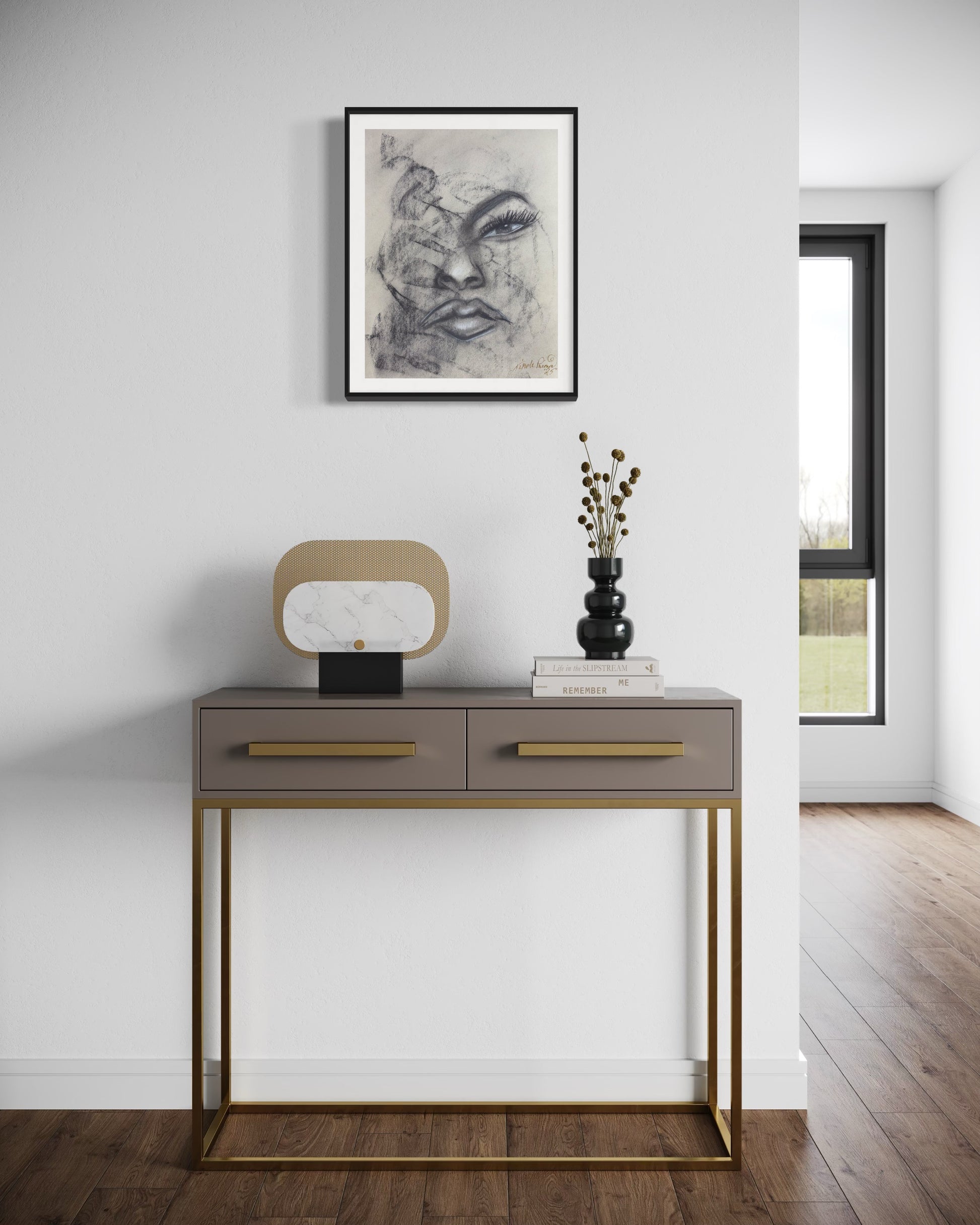 This piece captures the quiet resilience of a soul in motion. The bold gaze framed by soft shadows suggests an untold story of perseverance, where strength and vulnerability meet in graceful balance.